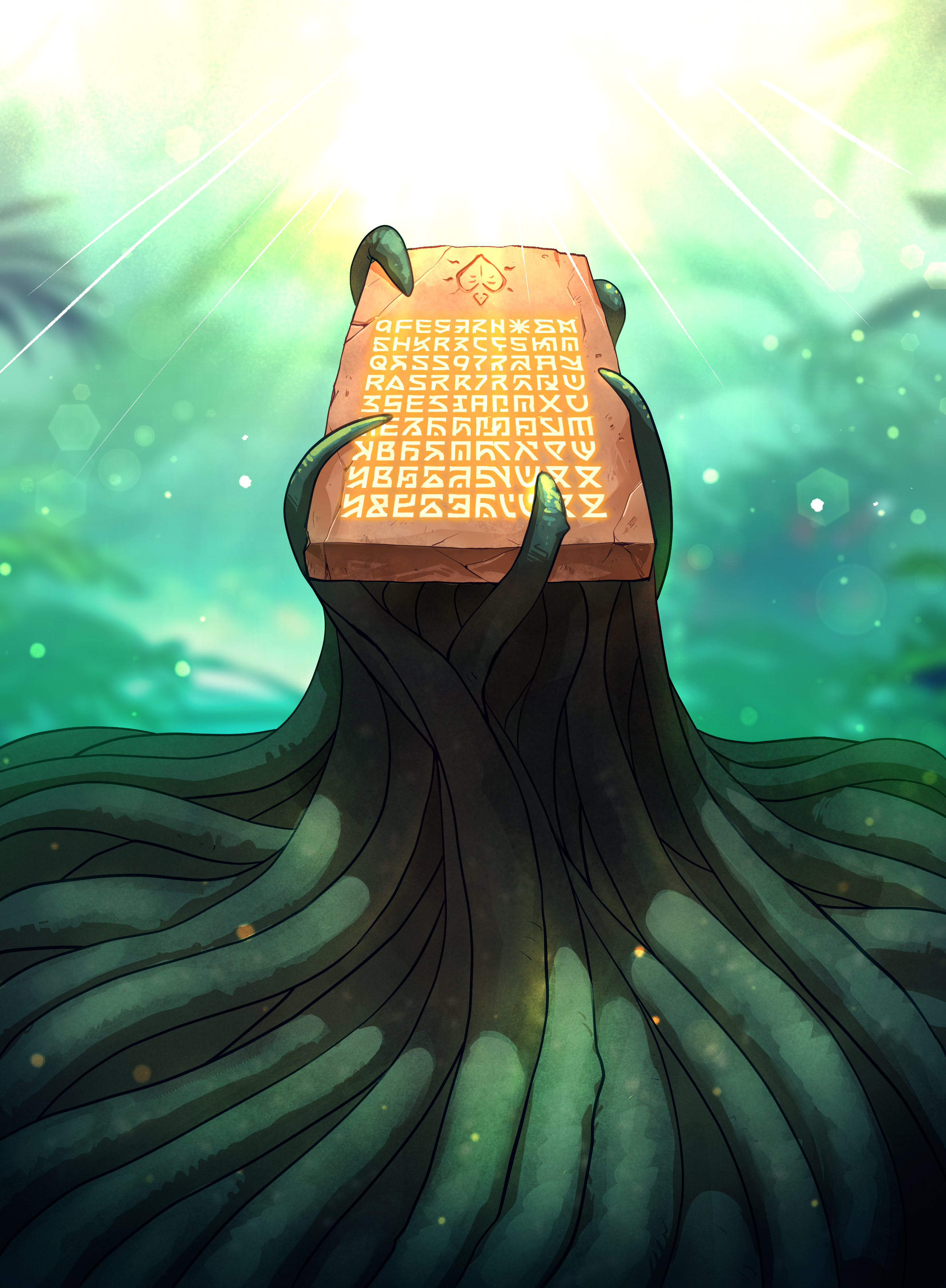 รากไม้โบราณชูแผ่นศิลาเรืองแสง สลักด้วยอักษรแห่งยุคสมัยที่สูญหาย