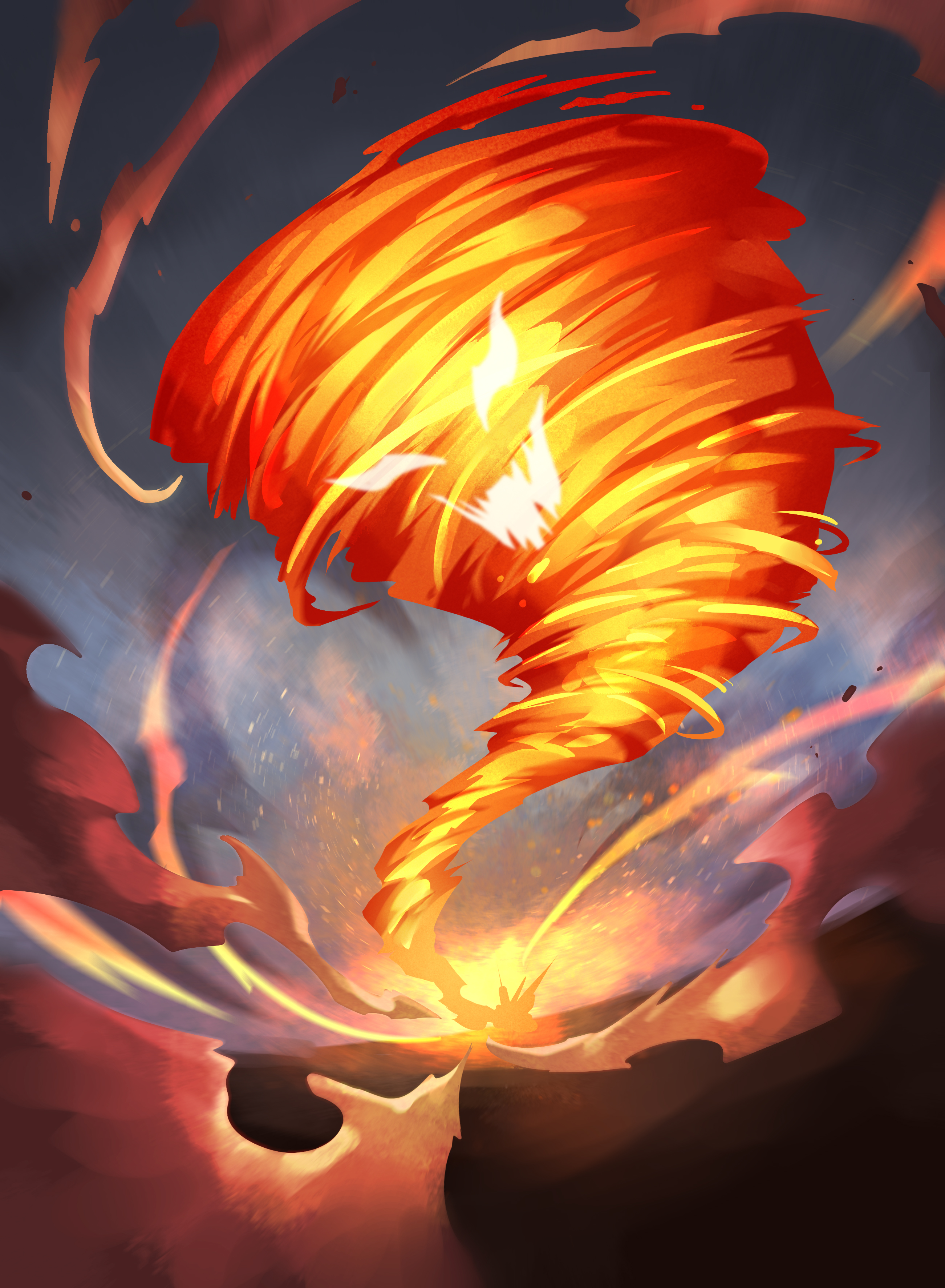 และคลุ้มคลั่งไม่สิ้นสุดทุกครั้งที่กรีดร้องเปลวเพลิงสีส้มแดงจะปะทุออกมาปกคลุมฟ้าเหมือนพายุเพลิง