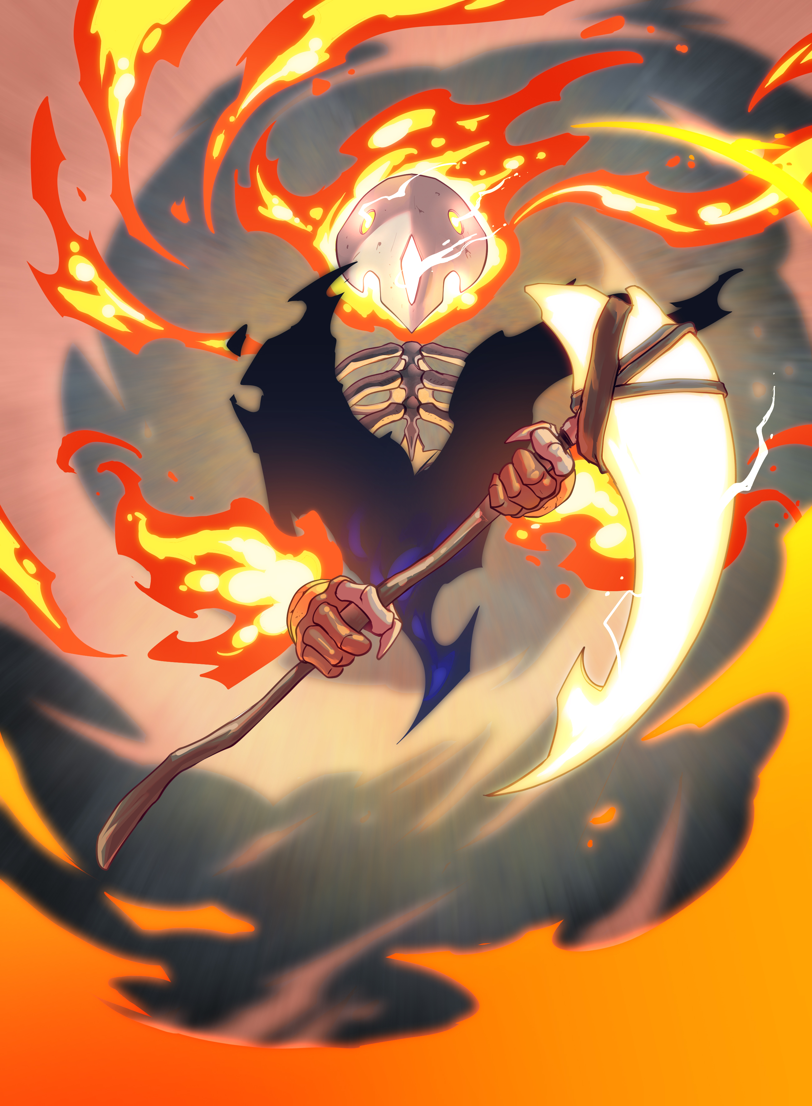 ยมทูตผู้ถือกำเนิดจากเพลิงนิรันดร์ โครงกระดูกที่โอบล้อมด้วยไฟลุกโชน