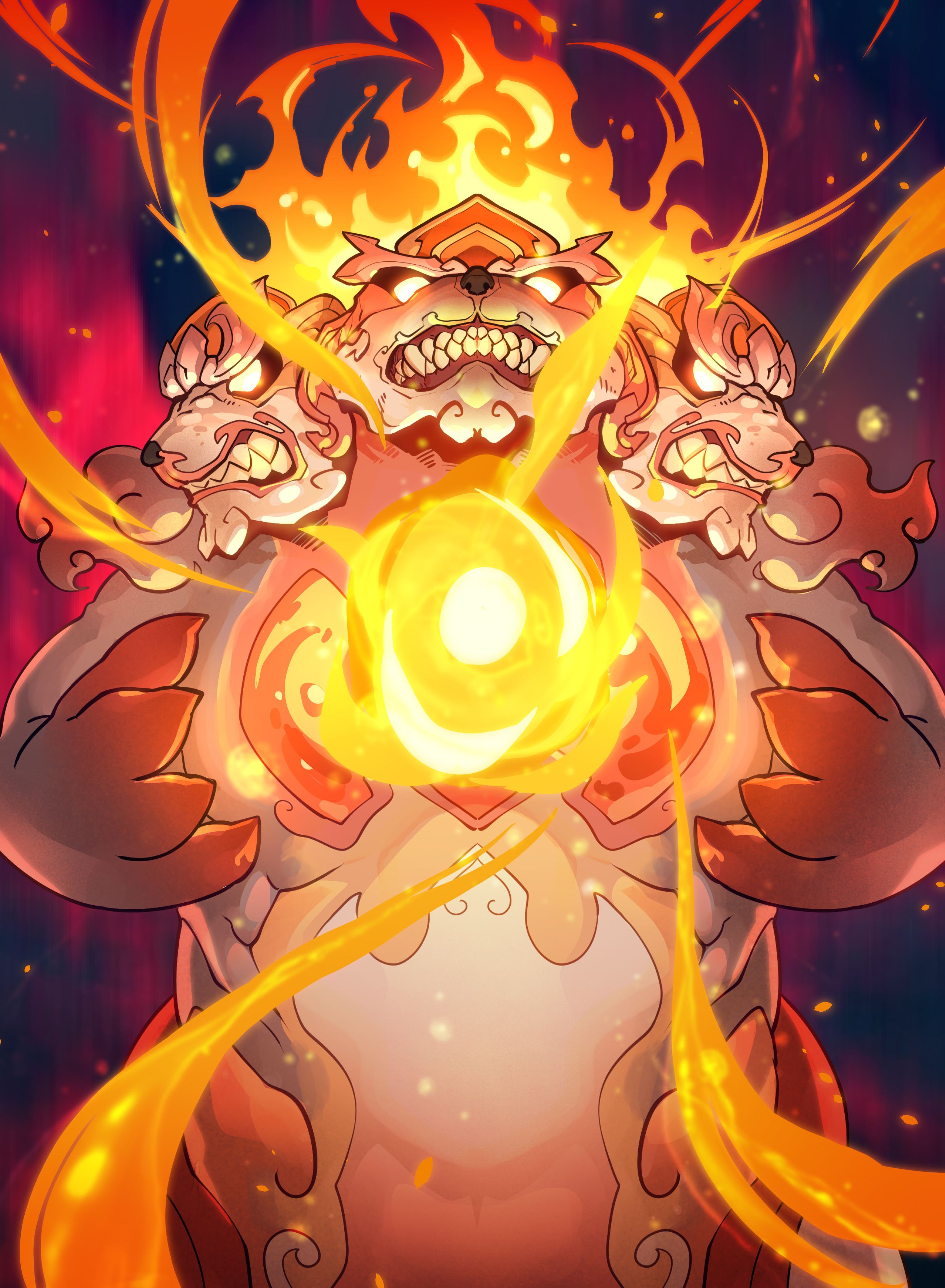 อสูรโบราณร่างยักษ์หัวเพลิงทั้งสาม เปลวไฟแต่ละหัวมีฤทธิ์ต่างกัน